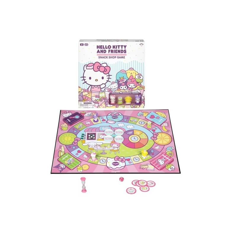 Collect snacks with Hello Kitty and Friends when you play the Snack Shop Game. This cute cooperative game for two to four players ages 6 and up is easy to learn and features favorite Hello Kitty characters. Players can play as Hello Kitty, Pompompurin, Keroppi, or Kuromi. Set up the game board with each of the four card themes placed on their matching spaces, the treat tokens placed on the snack shop window, and the “open” sign placed on the clock. Take turns rolling the die, moving that many spaces around the board, and performing whatever action you land on. Landing on Share means you draw a Share card and share something about you or a friend. Once you do, you take a treat token and place it face-up in front of you. All of the treats have a cute Hello Kitty theme, too. If you land on Care, draw the top Care card and do that caring activity. Once you do, collect a treat token. Draw a Surprise card if you land on Surprise. This card will have a surprise action for you to perform. If you land on Find, draw the top Find card. You’ll have 30 seconds to get up and find the object listed on the card. For instance, something with a heart or something pink. If you make it back to the table with the object before time runs out, you get a treat token. If not, you lose a treat token. Landing on any of the four Start spaces allows you to choose which pile to draw a card from. And landing on a clock means that you must move the “open” sign one spot around the clock. If the sign ever makes it to “closing time” on the clock, flip the sign over to “closed” and the game ends. If the final treat token is taken before the shop closes, then everybody wins. The game includes 60 cards, 13 tokens, four movers, a game board, a die, a sand timer, and instructions.