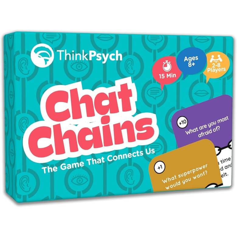 Chat Chains is a “game that connects us”. Its goal is to have the longest on-topic conversation. It comes with 75 Topic Cards, 60 Response Cards, 10 Activity Cards, and five Prompt Cards. The Topic and Activity Cards get shuffled together into a single draw pile. You’ll have two piles of Response Cards with the +1 sides face-up. (The +2 sides are for more advanced players who are ready to ask open-ended questions and give more detailed answers or comments.) Then, the Prompt Cards get placed facedown in a pile. Whoever is the Chat Starter draws a Topic Card and places it in the center of the play area. If it’s an Activity Card, do that activity, discard the card, and draw another Topic Card. There are two topic questions on each card, and the Chat Starter picks one to ask the player to their left. Once that player answers the question, they place a green Answer/Comment Response Card next to the Topic Card to start the Chat Chain. Now each player takes a turn to add to the conversation, adding a green Response card if they answer the question or adding a blue Response card if they asked a follow-up question. A player could even answer a question and ask a new one on the same turn. If a player gets stuck, they can draw a Prompt Card to help them continue the conversation and place that card in the Chat Chain. The Chat Chain breaks and the round ends when a player decides to end the conversation or a player goes off-topic or a player takes too long to respond. You can calculate a team score for the round by adding up the Topic Card points with the Response Card points of all players. You can also score individually by adding up the points on each player’s Response Cards. Now it’s the next player’s turn to be the Chat Starter. The whole game can end after a set number of rounds, a predetermined time limit, or a target team score is reached. This game can be played with two to eight players ages 8 and up.